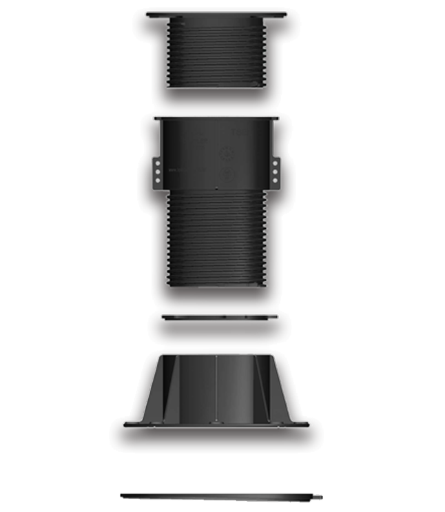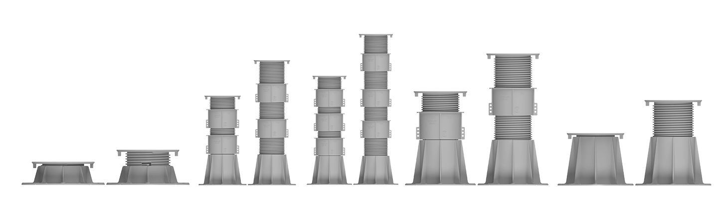 Всички пиедестали са съставени от цилиндричен основен елемент с диаметър 195 мм за опиране върху повърхността за полагане. Според модела може да имат междинен винт със заключваща система за сигустно.