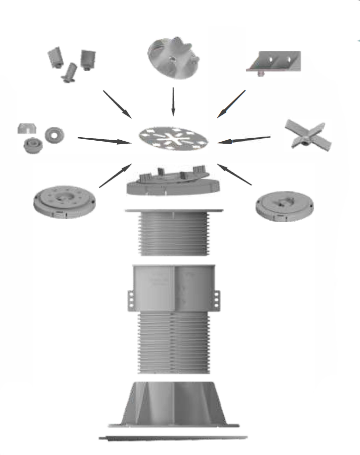 Крачетата за двоен под са съставени от цилидричен основен елемент с диаметър 195 мм за опиране върху повърхността за полагане, междинен винт със заключваща система за сигурност.